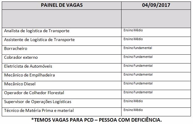 Para hoje as vagas disponíveis são para os cargos analista de logística de transporte, borracheiro, cobrador externo, eletricista de automóveis, mecânico de empilhadeira, mecânico diesel, operador de colhedor florestal, supervisor de operações logísticas, técnico de matéria prima e material.