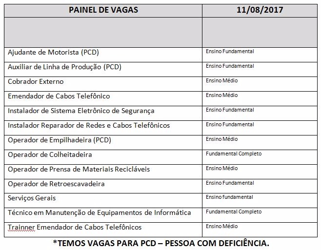 Para hoje (11) as vagas disponíveis são para os cargos de ajudante de motorista, auxiliar de linha de produção, cobrador externo, emendador de cabos telefônicos, instalador de sistemas eletrônicos de segurança, instalador reparador de rede e cabos telefônicos, operador de empilhadeira, operador de colheitadeira, operador de prensa de materiais recicláveis, operador de retroescavadeira, serviços gerais, técnico em manutenção de equipamentos de informática, treinner emendados de cabos telefônicos.