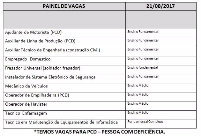 Para hoje as vagas disponíveis são para os cargos ajudante de motorista, auxiliar de linha de produção, auxiliar tpecnico de engenharia, empregado doméstico, fresador universal, instalador de sistema eletrônico de segurança, mecânico de veículos, operador de empilhadeira, operador de havister, técnico de enfermagem, técnico em manutenção de equipamentos de informática.