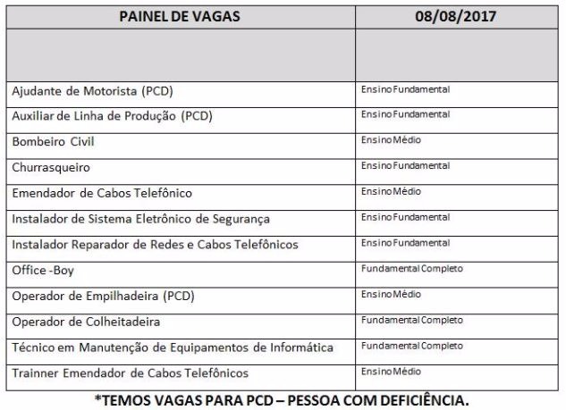Para hoje (8) as vagas disponíveis são para os cargos de ajudante de motorista, auxiliar de linha de produção, bombeiro civil, churrasqueiro, emendador de cabos telefônicos, instalados de sistemas eletrônicos de segurança, instalados reparados de redes e cabos telefônicos, Office-boy, operador de empilhadeira, operador de colheitadeira, técnico em manutenção de equipamentos de informática, trainner emendador de cabos telefônicos.