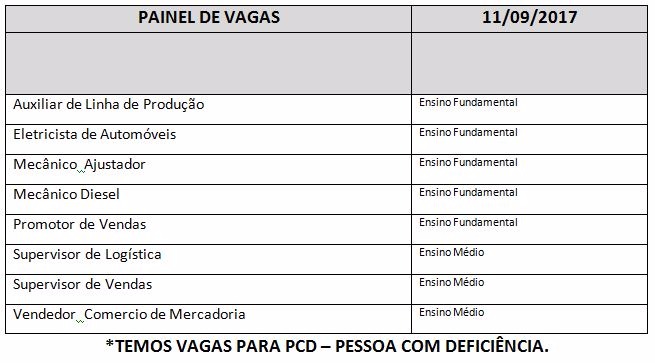 Para hoje as vagas disponíveis são para os cargos de auxiliar de produção, eletricista de automóveis,mecânico diesel, promotor de vendas, supervisor de logística, supervisor de vendas, vendedor comercio de mercadorias.
