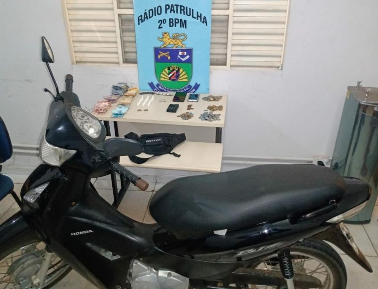 No veículo estavam um jovem de 20 anos e uma mulher de 25 anos, os quais traziam consigo 02 pinos de cocaína e cerca de 5 gramas de maconha, além de R$ 531,00, uma máquina de cartão (mercado pago), indicando possível envolvimento com a mercância de drogas. Em checagem do veículo Honda Biz foi constatado ser produto de furto.