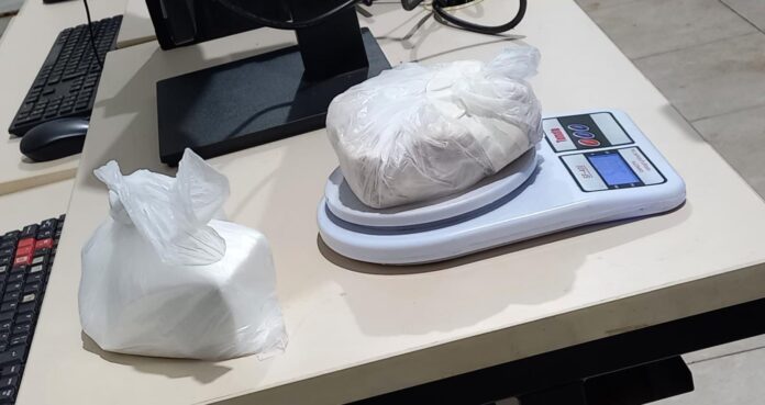 Durante a inspeção, e com o apoio de uma policial feminina, foram localizados dois pacotes contendo aproximadamente 500 gramas de cocaína e 480 gramas de pasta base, supostamente escondidos com a passageira.