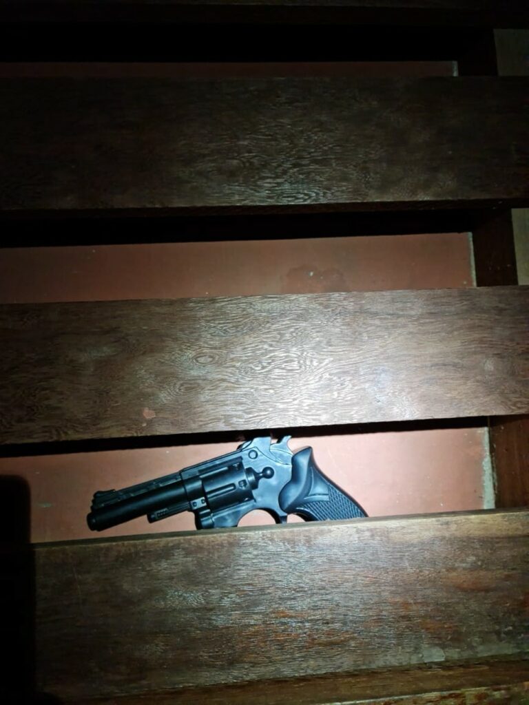 Ela confirmou que um casal de moto estava ali, quando os policiais foram até o quarto e localizaram os suspeitos. A mulher mostrou o simulacro de arma de fogo escondido embaixo do colchão. O veículo que eles estavam possui cadastro de roubo.