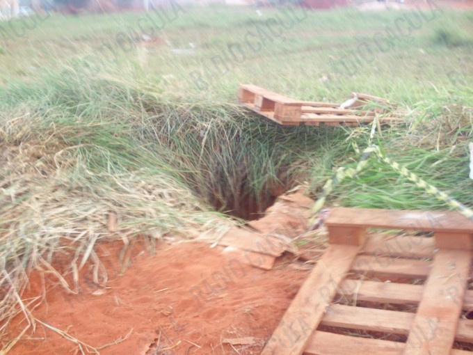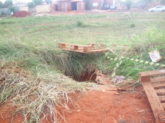 O buraco de cerca de 5 metros de profundidade é estreito e fica localizado em meio ao matagal, prejudicando a visão de quem passa pelo local, no terreno em frente ao problema moram mais de 1.200 famílias do Residencial Novo Oeste.