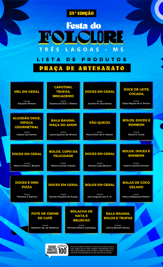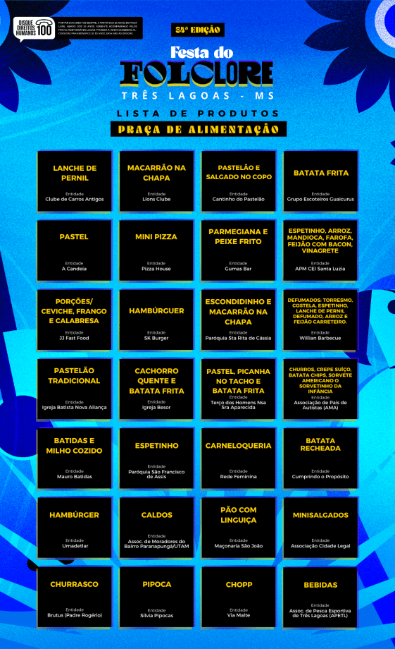 A praça de alimentação deste ano está repleta de opções deliciosas, oferecidas por diversas instituições locais. Na feira de artesanato, 19 artesãos vão expor seus trabalhos e vender diversos tipos de doces e produtos naturais, que são um ótimo complemento para fechar a noite após uma boa comida tradicional na praça de alimentação. De quebra, você ainda pode levar uma lembrancinha de Três Lagoas e da própria Festa ou encontrar itens exclusivos feitos à mão para a decoração da sua casa. Confira o que cada uma delas estará vendendo: