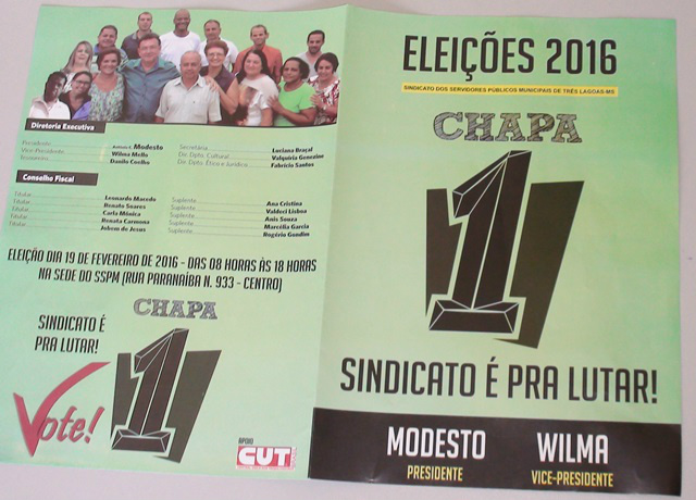 A chapa “Sindicato é pra lutar” encabeçada por Antônio Carlos Modesto, ganhou a eleição para comandar os rumos do Sindicato dos Servidores Públicos Municipais de Três Lagoas (MS), no triênio 2016/2019.