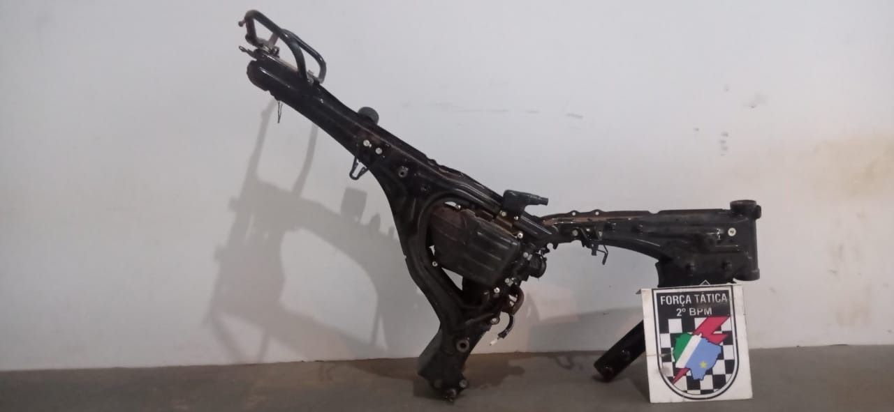 O chassi de uma moto Honda CG 160 Fan de cor vermelha ano 2019 de placa QAT-3671 foi localizado em um matagal na região.