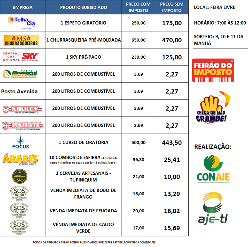 Mais de 100 cidades, em todo o Brasil, participam da mobilização e em Três Lagoas o feirão será realizado no dia 27 de maio, das 7h às 12h na feira livre, que acontece na Avenida Rosário Congro, onde empresas parceiras irão realizar demonstração da venda de produtos sem a incidência de impostos.