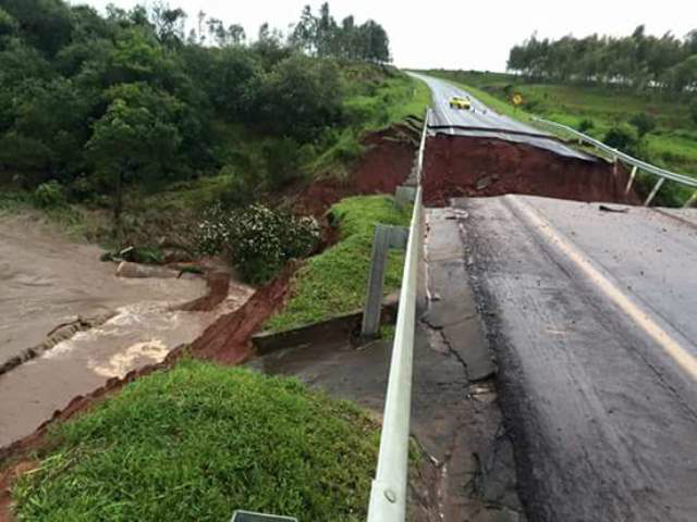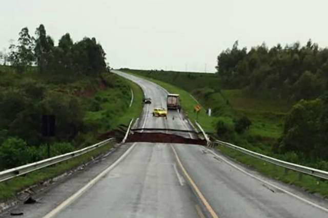 Por volta das 8h 30m de ontem a drenagem da rodovia não suportou e o asfalto desmoronou. Uma grande parte da pista cedeu e uma cratera se formou na rodovia.