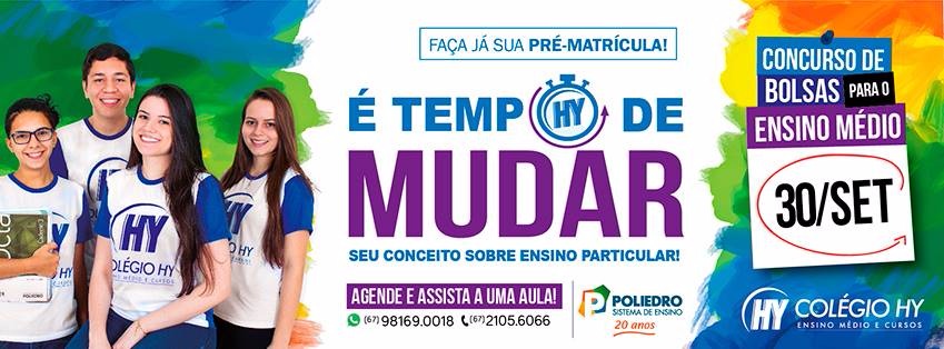 Seguem até o dia 29 de setembro as inscrições gratuitas para o concurso de bolsas de estudo para o ensino médio do colégio HY em Três Lagoas (MS). A prova será realizada no dia 30 de setembro, a partir das 8 horas.