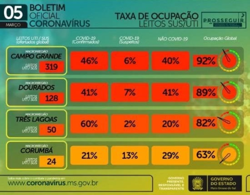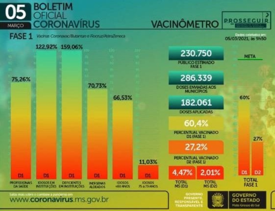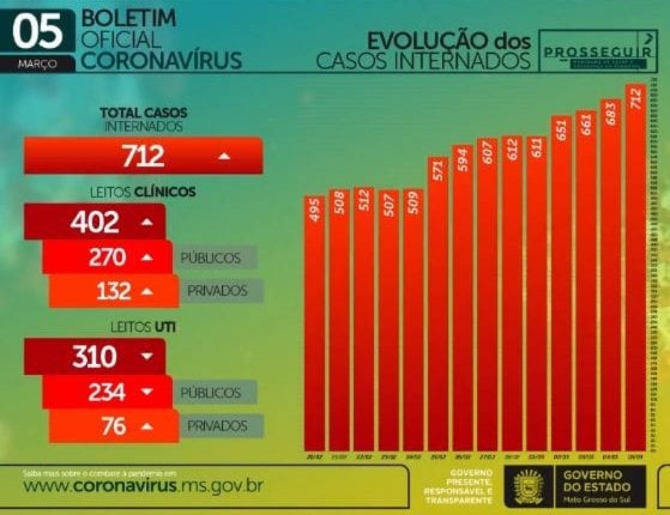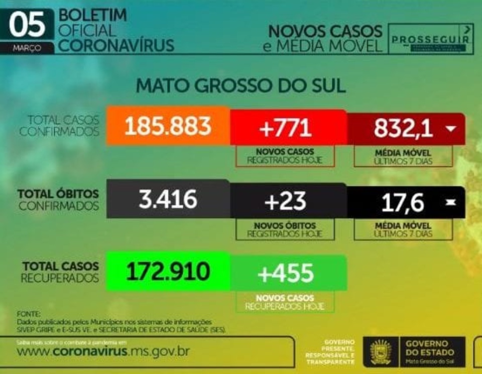 Mato Grosso do Sul já soma 185.883 casos confirmados de Covid-19, com 771 novos registros nesta sexta-feira (5). Foram registradas mais 23 mortes, conforme o boletim epidemiológico do novo coronavírus, apresentado pela SES (Secretaria de Estado de Saúde).