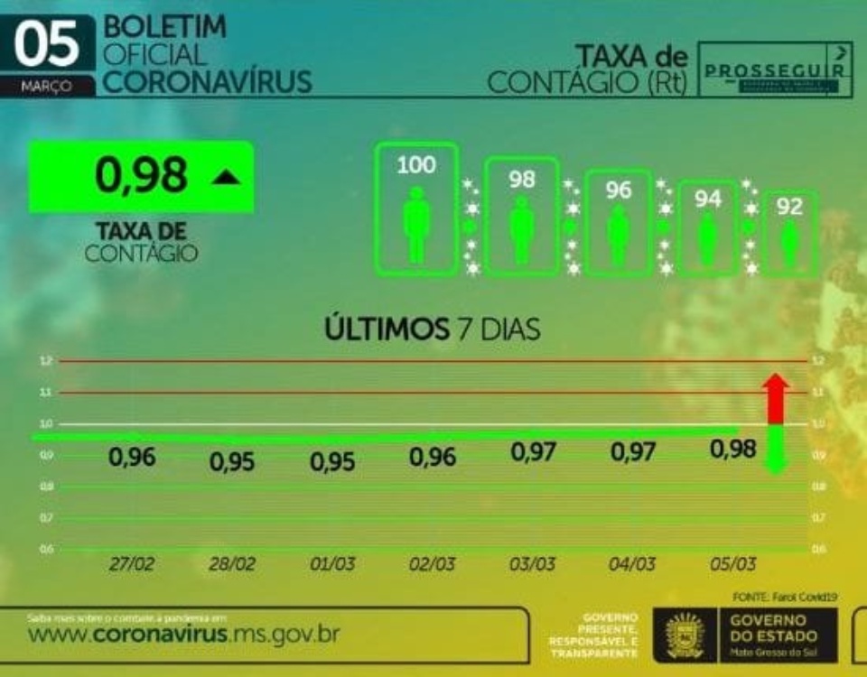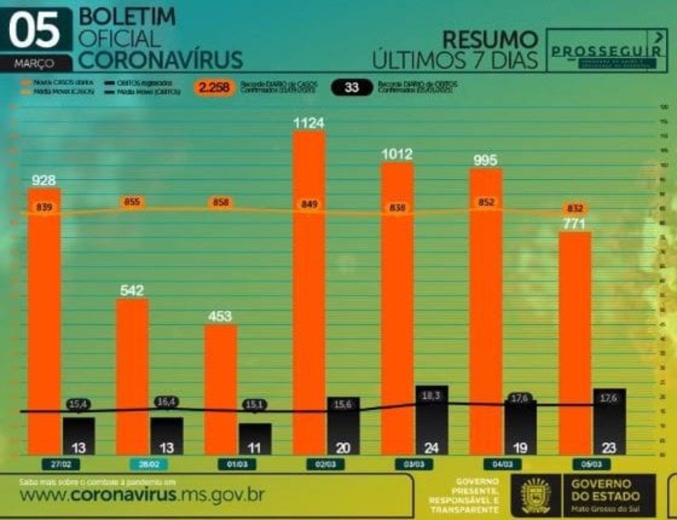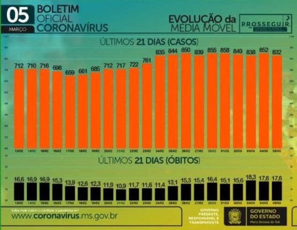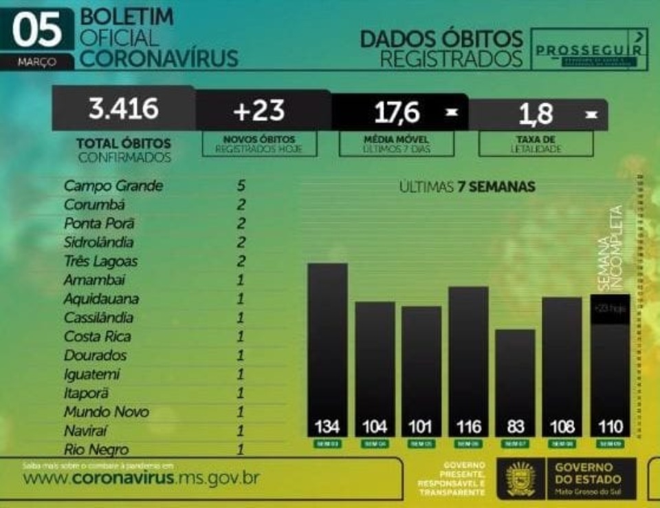 Com base nos números, a média móvel no Estado foi calculada em 832,1 casos por dia, nos últimos 7 dias. O boletim traz que nas últimas 24 horas foram registrados 23 óbitos, elevando o total de vítimas fatais em MS para 3.416 e a média móvel em 17,6 óbitos por dia, nos últimos 7 dias, além de taxa de letalidade de 1,8%.