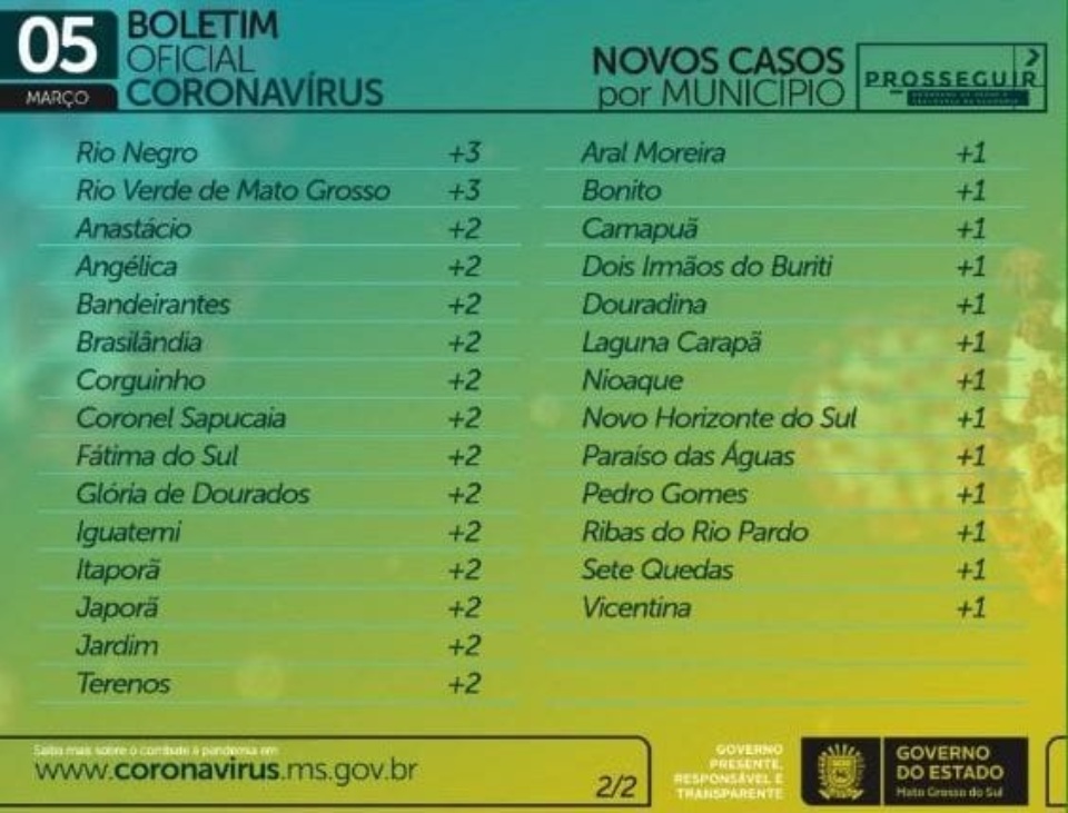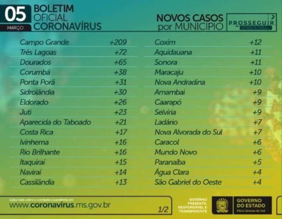 Os novos casos de hoje trazem Campo Grande à frente, com 209 novos casos, seguida por Três Lagoas (72), Dourados (65), Corumbá (38), Ponta Porã (31), Sidrolândia (30), Eldorado (26), Juti (23), dentre outros. Confira a tabela na galeria abaixo para mais detalhes e demais localidades.