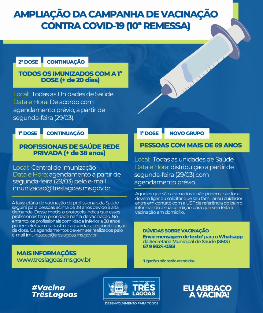 Esta é a 10ª etapa de vacinação e, a partir desta segunda-feira (29), será realizado o agendamento da vacinação da 1ª dose pessoas idosas acima de 69 anos de idade. Além disso, será dada continuidade na aplicação da 2ª dose em todos os cidadãos (comuns ou profissionais da saúde) que já tomaram a 1ª dose a mais de 20 dias.