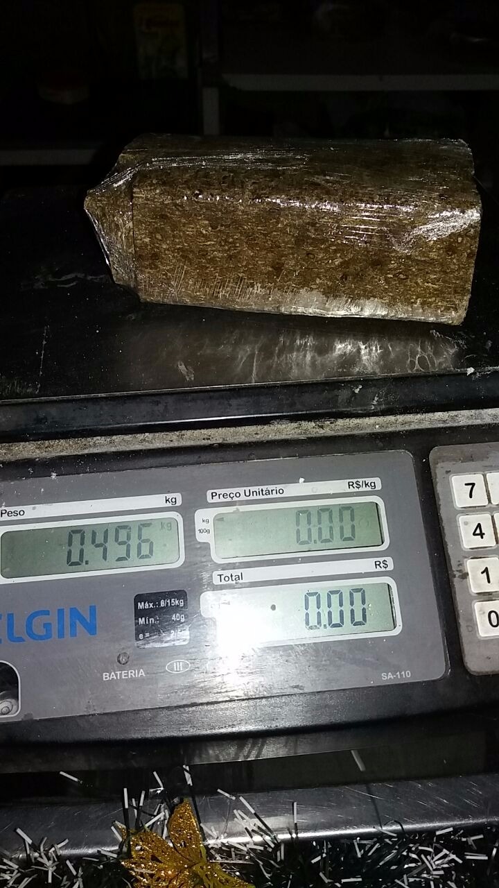 O Policial fez contato com o morador da casa que autorizou as buscas em seu imóvel. No local foi localizado um tablete de maconha, que após pesagem totalizou 496 g. O jovem disse que comprou a droga de uma pessoa desconhecida pelo valor de R$ 500.