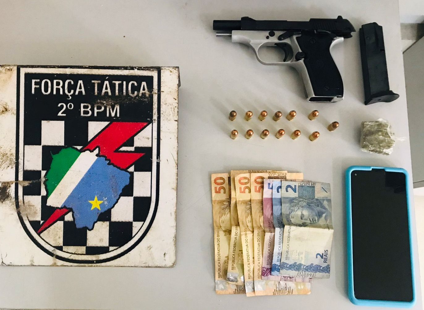 Em busca os policiais militares localizaram a porção mencionada que pesou 18 gramas. No local também foi localizada e apreendida uma pistola calibre .380, de Marca Tisas, municiada com 13 munições.