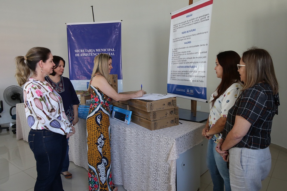 A assinatura dos termos de transferência dos computadores da SMAS para a SEMEC e o termo de entrega desses contou também com a presença da vice-presidente do Conselho Municipal de Assistência Social (CMAS), Daiane Caroline Queiroz Ramos Mateus e diretoras de outros setores, ligados ao benefício do Bolsa Família em Três Lagoas.