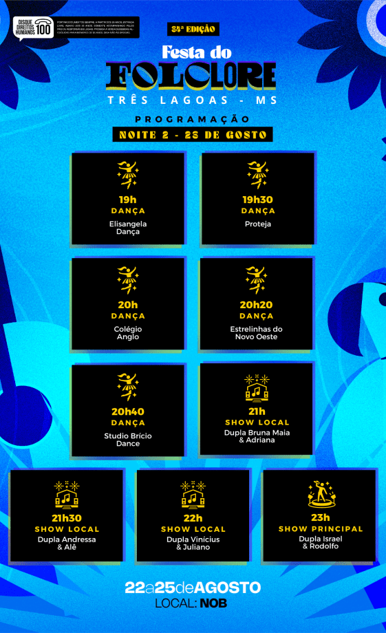 Já começou a 34ª Edição da Festa do Folclore de Três Lagoas. A organização do evento acaba de divulgar o cronograma completo de todas as atrações locais e nacionais que se apresentarão em cada noite antes do show principal e também durante o almoço de domingo, 25 de agosto.