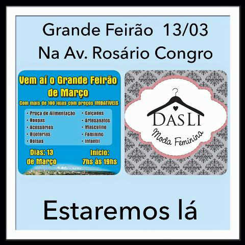 O evento que será na Avenida Rosário Congro se inicia às 07h e contará com a presença da loja Dasli Moda Feminina, que traz o melhor da moda para as mulheres ficarem lindas e pagarem um precinho super especial.