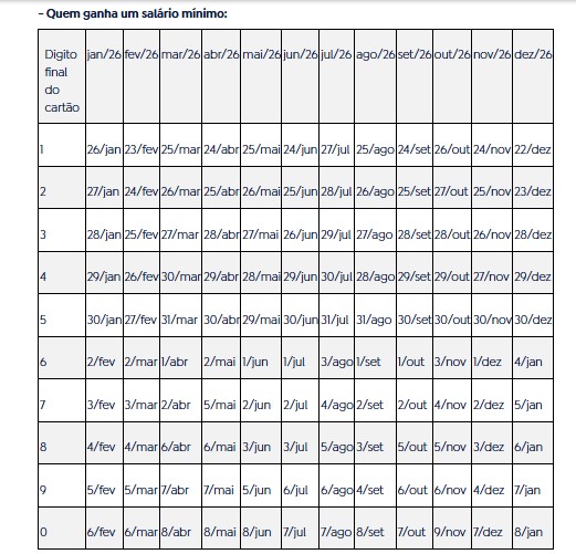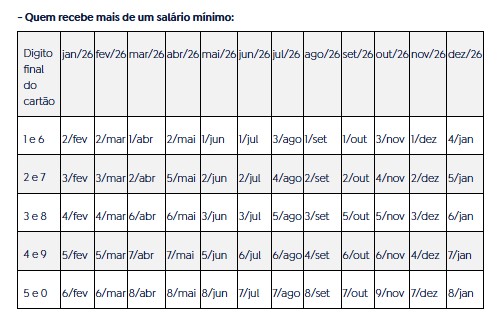 Os depósitos seguirão a sequência de anos anteriores, com um calendário para quem recebe um salário mínimo e outro para quem ganha mais de um salário. Para cada categoria, as datas de pagamento serão determinadas pelo número final do cartão, sem considerar o dígito verificador (que vem depois do traço).