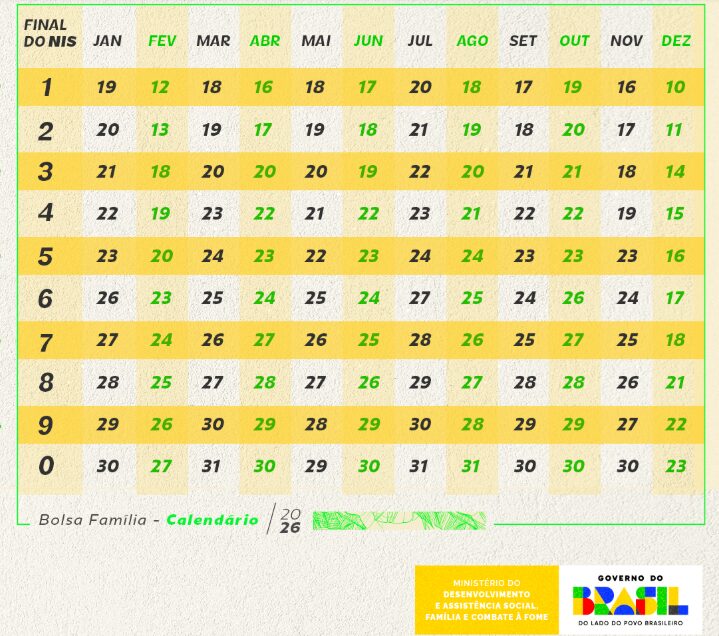 De acordo com o ministério, os pagamentos ocorrerão nos últimos dez dias úteis de cada mês. A única exceção é o mês de dezembro, quando o calendário é antecipado para garantir que as famílias tenham acesso ao benefício antes das festas de fim de ano.
