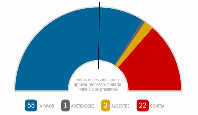 Por 55 votos a 22, os senadores decidiram que a petista deve ser julgada por crime de responsabilidade.
