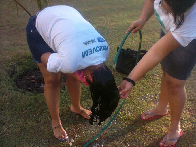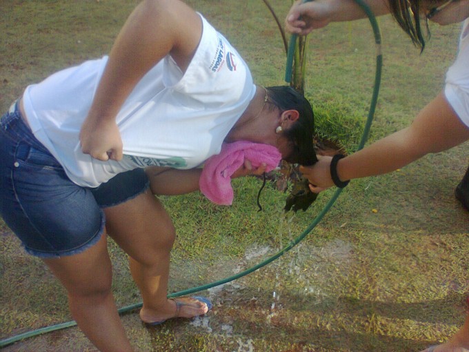 Professora lava cabelo de aluna com mangueira por falta de estrutura.]Foto: Rádio Caçula.