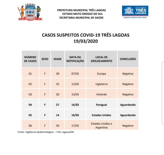 TRÊS LAGOAS (MS) – A Secretaria Municipal de Saúde (SMS) de Três Lagoas, por meio da Vigilância Epidemiológica, setor da Diretoria de Vigilância em Saúde e Saneamento, divulgou no final da tarde desta quinta-feira (19) o Boletim atualizado do monitoramento do Coronavírus (Covid -19).