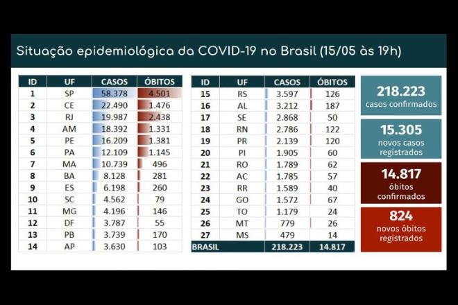 BRASIL (BR) – O balanço diário do Ministério da Saúde sobre o novo coronavírus registrou 15.305 novos casos confirmados, totalizando 218.223. Foi o maior número registrado em 24 horas desde o início da pandemia no país. O resultado marcou um acréscimo de 7,5% em relação a quinta (14), quando o número de pessoas infectadas estava em 202.918.