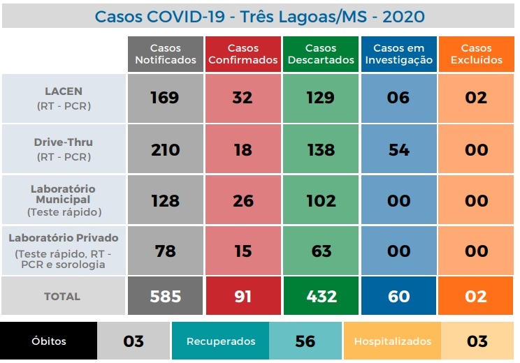 TRÊS LAGOAS (MS) – A Prefeitura de Três Lagoas, por meio do setor de Vigilância Epidemiológica da Secretaria Municipal de Saúde (SMS), divulgou o Boletim Epidemiológico COVID-19 desta quinta-feira (14). Foram confirmados mais 7 casos positivos para a doença, alcançando a marca de 91 pacientes diagnosticados com o novo coronavírus no município.