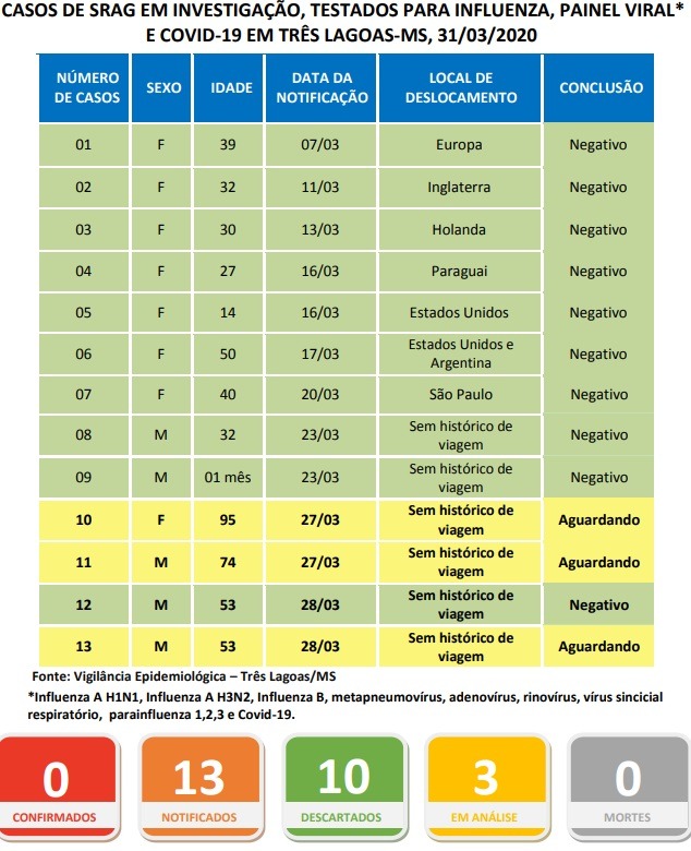 TRÊS LAGOAS (MS) – A Secretaria Municipal de Saúde (SMS) de Três Lagoas divulgou na tarde desta terça-feira (31) o Boletim Diário informando sobre casos suspeitos de COVID-19 na Cidade. Dentre os 13 casos notificados, apenas três aguardam os resultados dos exames. Os demais foram descartados.