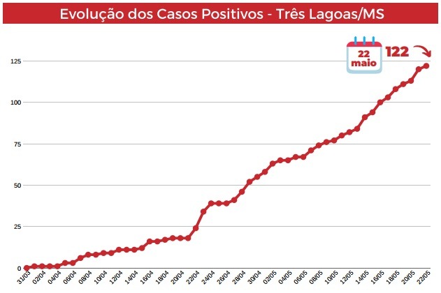 Com isso, Três Lagoas chega a 122 casos positivos da doença, 632 descartados como negativo, 45 casos ainda em investigação e 02 excluídos, conforme dados da Vigilância Epidemiológica. O número de óbitos pela doença é de 04 pessoas. 77 pessoas já se recuperaram da COVID-19.