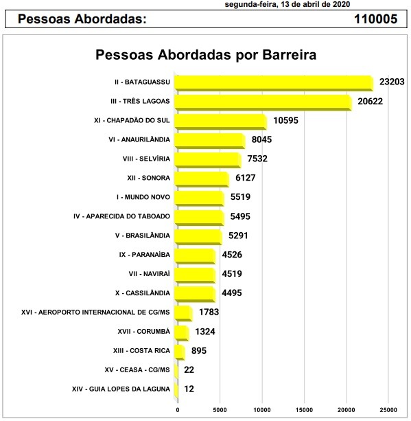 Segundo o boletim, divulgado nesta segunda (13), na somatória de abordagens das 17 barreiras montadas em todo o Estado de MS, já foram abordadas cerca de 110.005 pessoas. Dentre as cidades, Três Lagoas (MS) continua como a segunda no ranking de pessoas e veículos abordados.