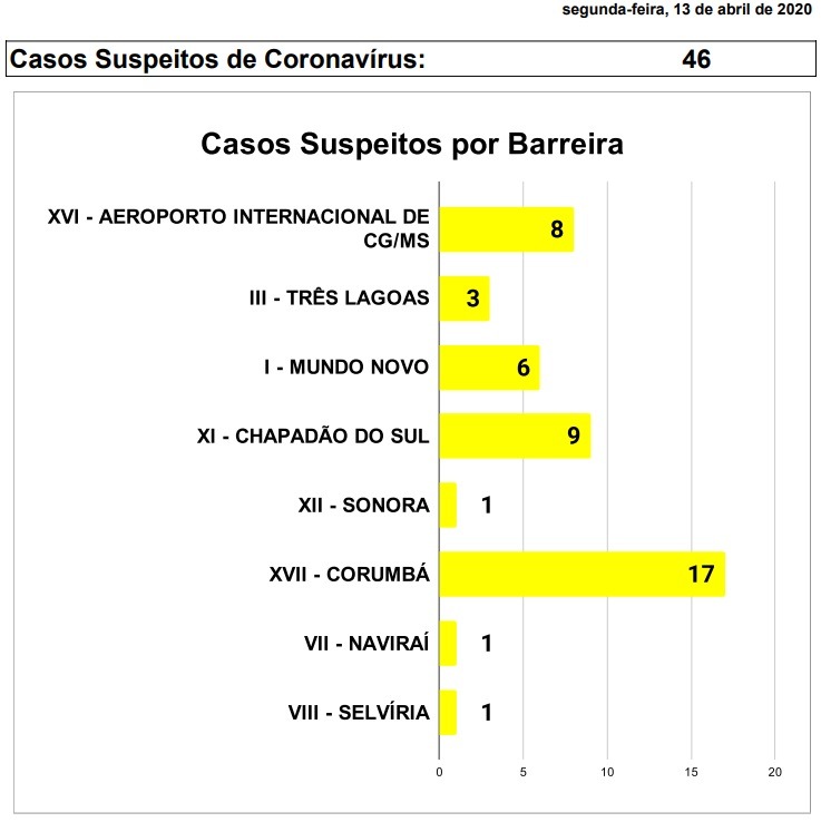 Sendo assim, nas Barreiras Sanitárias até o momento foram identificados: 17 casos suspeitos em Corumbá, 9 casos em Chapadão do Sul, 8 casos no Aeroporto Internacional de CG/MS, 6 casos em Mundo Novo, 3 casos em Três Lagoas, e em Sonora, Corumbá, Naviraí e Selvíria um caso cada.
