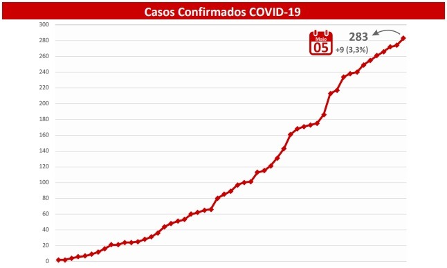 Dos 283 casos confirmados, 73 estão em isolamento domiciliar, 181 estão sem sintomas e já estão recuperados. 22 estão internados, sendo 14 em hospitais públicos e oito em hospitais privados.