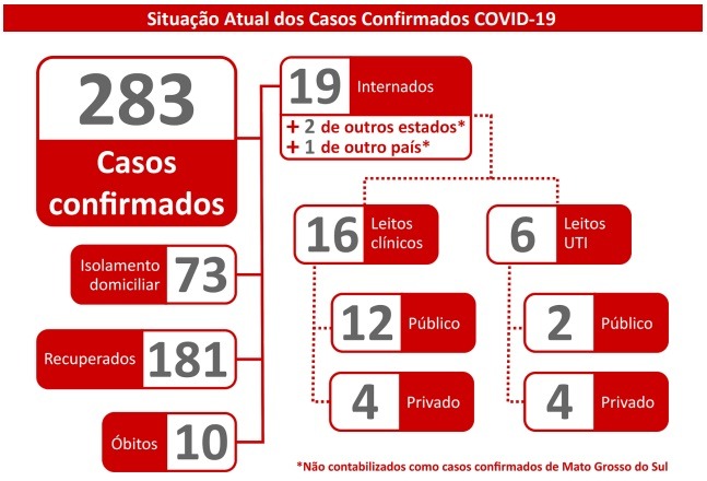 Dos 283 casos confirmados, 73 estão em isolamento domiciliar, 181 estão sem sintomas e já estão recuperados. 22 estão internados, sendo 14 em hospitais públicos e oito em hospitais privados. Dois pacientes internados são procedentes de fora do Estado e um é de fora do País. Foram registrados dez óbitos.