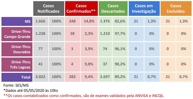 Das 1.238 amostras coletadas no Drive Thru Covid-19 em Campo Grande, 1.210 deram negativo e 28 deram positivo. Das 77 amostras coletadas no Drive Thru Covid-19 em Dourados, três deram positivas e 73 foram descartadas. Das 41 amostras coletadas no Drive Thru Covid-19 em Três lagoas, 37 deram negativo e quatro positivo.