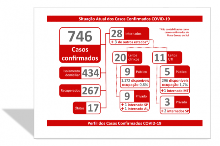Dos 746 casos confirmados, 434 estão em isolamento domiciliar, 267 estão sem sintomas e já estão recuperados. 31 estão internados, sendo 15 em hospitais públicos e 16 em hospitais privados. Três pacientes internados são procedentes de fora do Estado. Foram registrados 17 óbitos.
