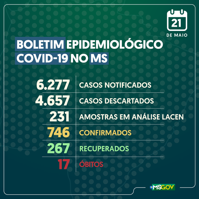 MATO GROSSO DO SUL (MS) – Com mais 53 exames positivos para coronavírus (Covid-19) nas ultimas 24 horas, o número de casos confirmados da doença no Estado chega a 743. As informações foram apresentadas nesta quinta-feira (21.05) em coletiva de imprensa online com autoridades do Governo do Estado.