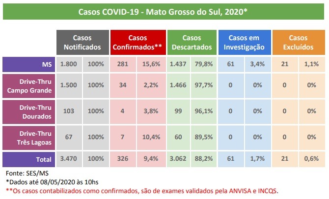 MATO GROSSO DO SUL (MS) – O 11º óbito no Estado é de um idoso de 95 anos, morador de Campo Grande. A morte foi confirmada pela Secretaria Municipal de Saúde (SESAU) nesta sexta-feira (8) juntamento com a divulgação de mais 15 casos positivos da doença, alcançando assim 326 casos em todo o Estado. Dos novos casos, 3 são da Capital e 12 de Dias Lopes da Laguna que, nesta sexta-feira (8), é a primeira cidade de MS a decretar “lockdown”.