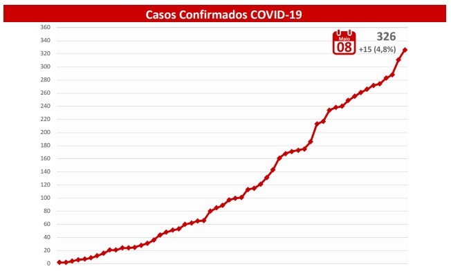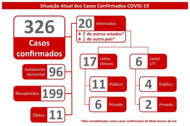 Na atualização dos dados, nesta sexta-feira (8), o Estado possui 15 novos casos confirmados, chegando a 326. São 199 pacientes que se curaram da doença. Outras 96 pessoas ainda continuam em isolamento domiciliar e 20 permanecem internadas em leitos públicos e privados.