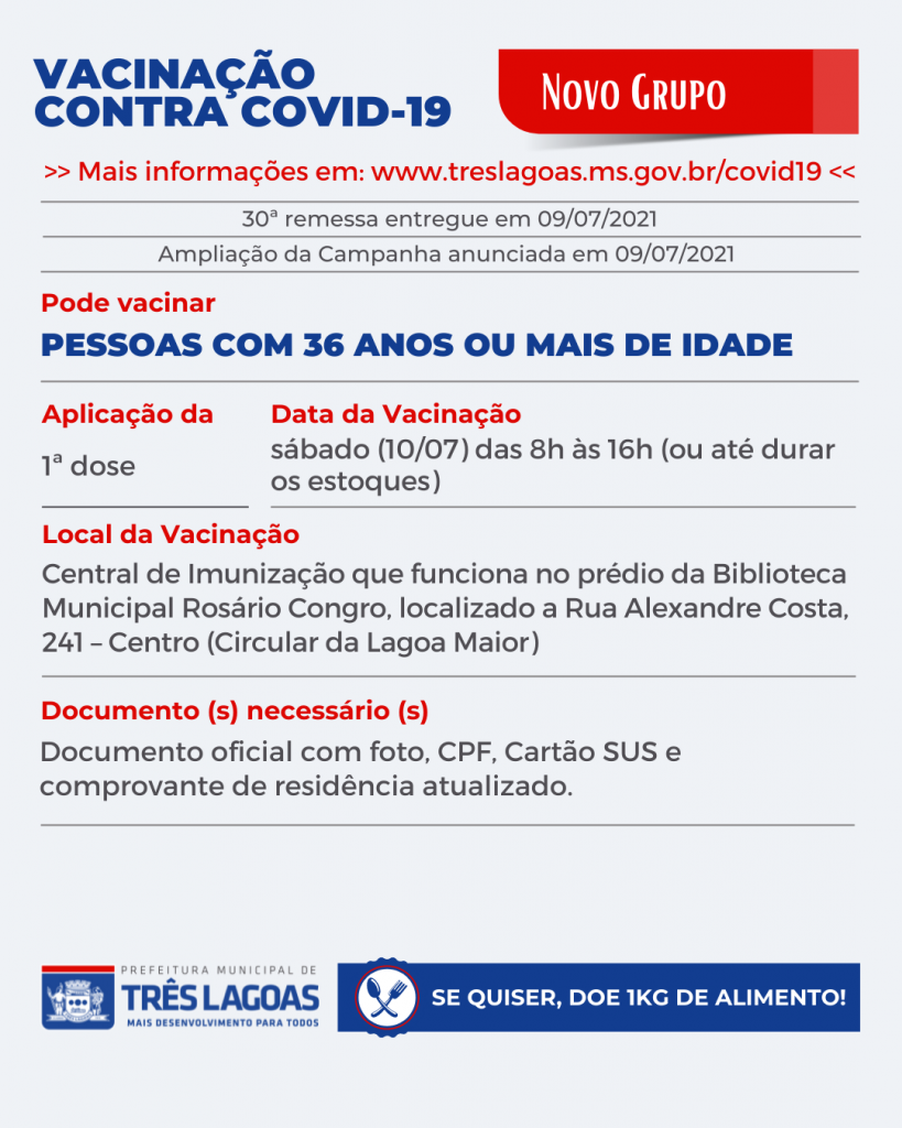 Conforme a pasta, as doses serão destinadas para a imunização da população em geral que tenha 36 anos ou mais de idade. A ação será realizada na Central de Imunização que funciona no prédio da Biblioteca Municipal Rosário Congro, localizado a Rua Alexandre Costa, 241 – Centro (Circular da Lagoa Maior) das 8h às 16h (ou até durar os estoques) deste sábado (10).