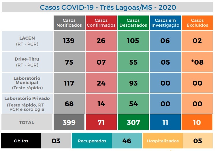 Conforme os dados, 46 pessoas já se encontram recuperadas do vírus, 11 estão sob investigação e, atualmente, Três Lagoas contabiliza 71 casos positivos.