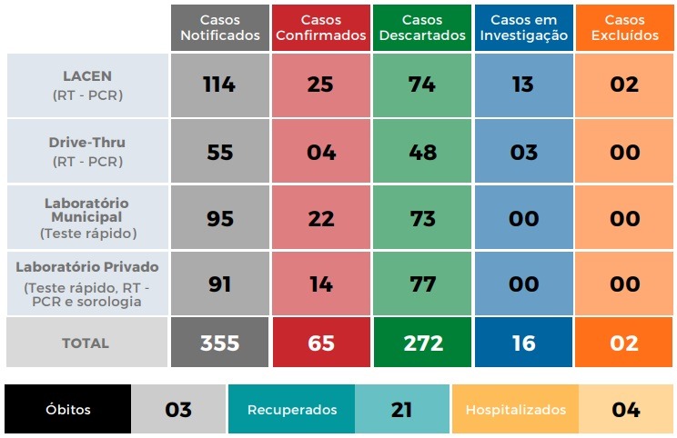 De acordo com o boletim epidemiológico, o município registrou até o momento 355 casos notificados como suspeitos para a Covid-19. Dos 65 casos positivos para a doença, 25 foram confirmados pelo laboratório de referência do Estado (Lacen), 04 pelo Drive-Thru, 22 pelo laboratório do município (teste rápido) e 14 por laboratório particulares (RT-PCR, teste rápido e sorologia).