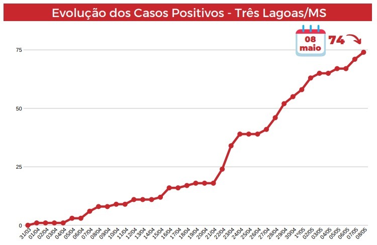 Três Lagoas chegou nesta sexta-feira (8) a 74 casos confirmados da doença, dos 429 notificados. Destes, 313 foram descartados, 02 excluídos e 40 aguardam resultado de exames.