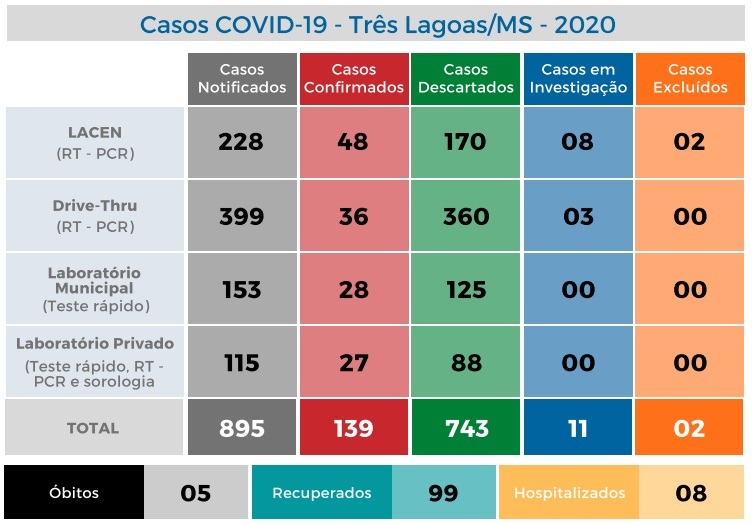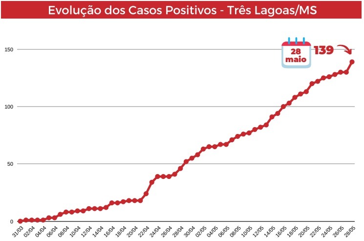 TRÊS LAGOAS (MS) – A Secretaria Municipal de Saúde, por meio do setor de Vigilância Epidemiológica, divulgou o boletim diário da COVID-19, referente aos números desta quinta-feira (28), em Três Lagoas. De acordo com o divulgado, o município possui 139 casos confirmados para o novo coronavírus.