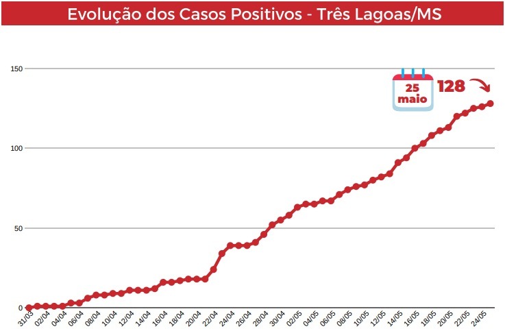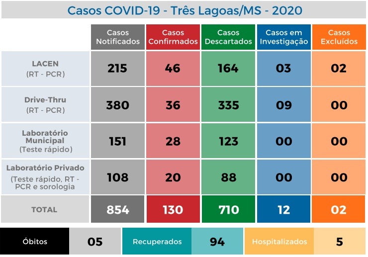 Outros 04 casos finalizaram a quarentena, chegando assim a 94 recuperados. Portanto Três Lagoas chegou a 130 casos positivos, entre eles 94 recuperados e 05 óbitos, totalizando 31 casos ainda ativos da doença.