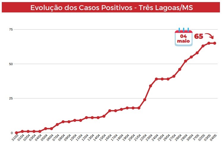 TRÊS LAGOAS (MS) – A Secretaria Municipal de Saúde (SMS), por meio do setor de Vigilância Epidemiológica, divulgou o mais um novo Boletim Epidemiológico de COVID-19 de Três Lagoas. No dia de hoje nenhum novo caso da doença foi registrado permanecendo em 65 o número de pacientes confirmados com o novo coronavírus.