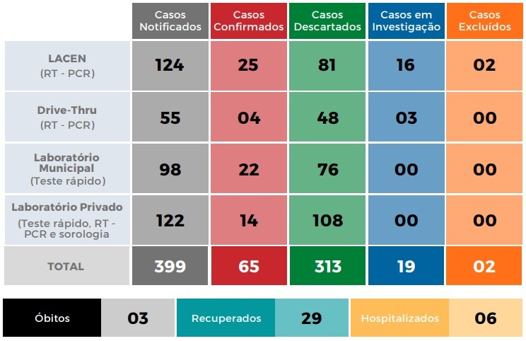 Nenhum novo caso foi registrado como positivo nesta segunda-feira (4). O Município ainda tem 65 casos confirmados, dos 399 testes realizados, 19 casos ainda estão em investigação, enquanto 313 foram descartados e 02 excluídos.